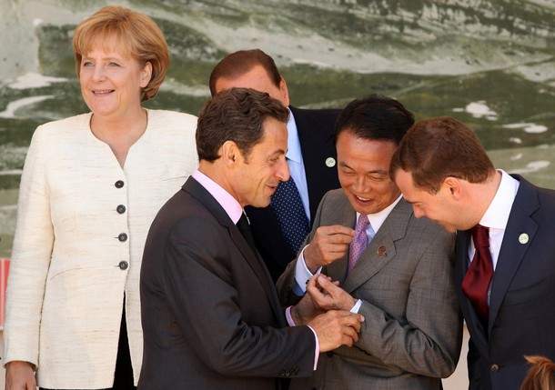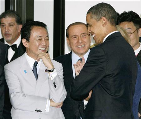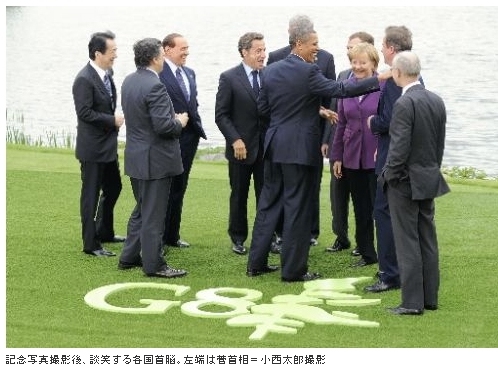 ↑G8で話題の中心になる麻生さん ↑G8で話題に取り残される菅さん